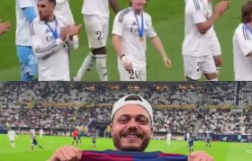 巴萨球迷向皇马球员展示4-0球衣,吕迪格举起奖牌回击